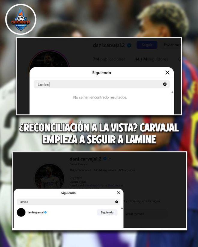 雷速体育10月30日讯 据西班牙电视节目《El Chiringuito》报道,在国家德比结束后,皇马队长卡瓦哈尔已在Instagram上关注了巴萨新星亚马尔。卡瓦哈尔的这一社交举动,引发了外界对两人关系走向的议论。